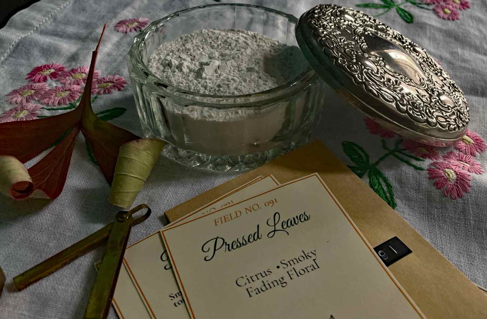 A specimen of autumn — woodsmoke, citrus, fading peony.Discover the Seasonal Woods Dusting Powder.