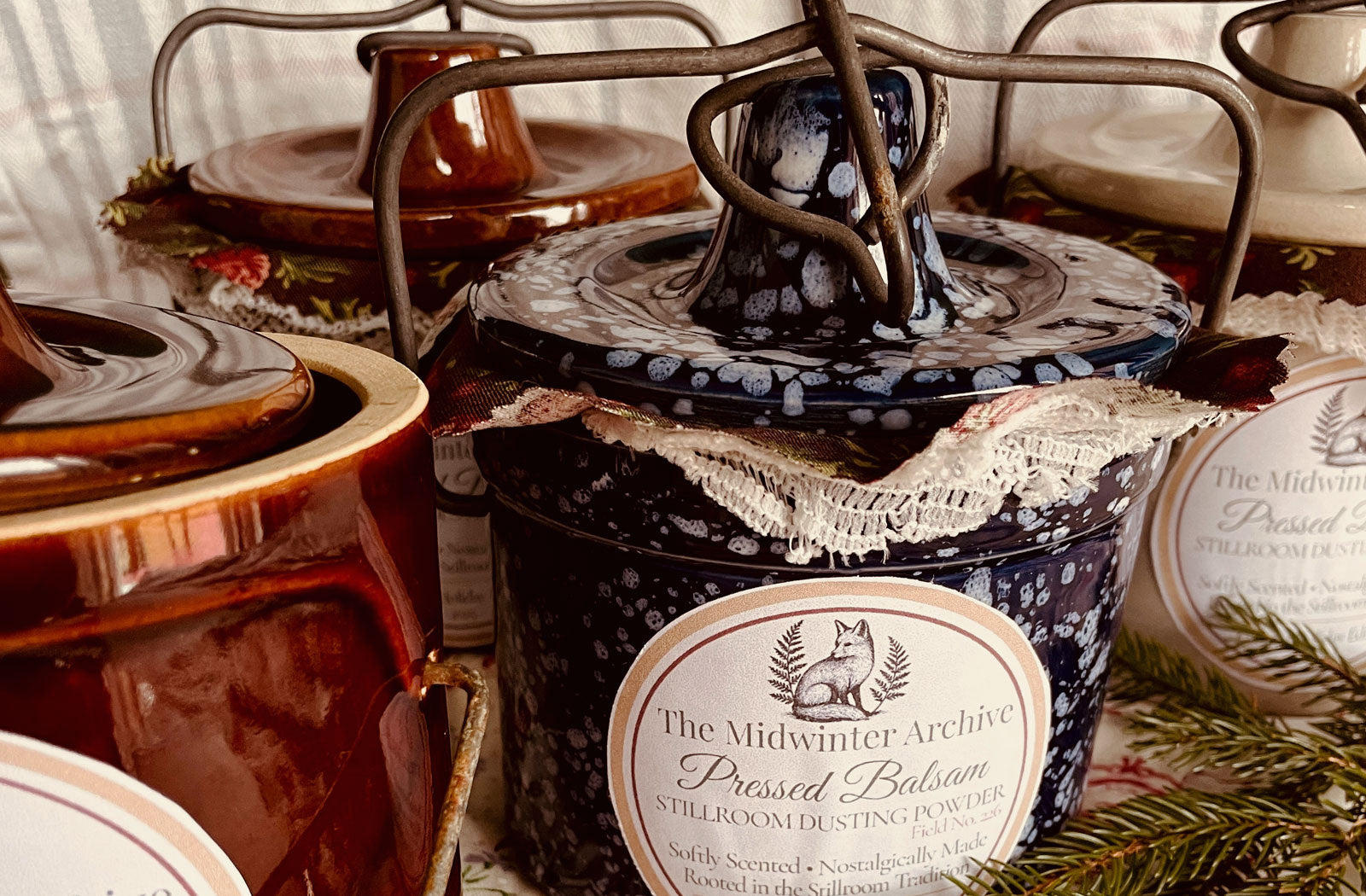 The scent of balsam and hearth smoke lingers in the mountain air as winter settles across the ridge. In the stillroom, jars are unwrapped, puffs sewn, and powders milled for the cold months ahead. Each vessel — crock, tin, or vintage jar — carries a quiet ritual of winter comfort, wrapped in story and tradition.