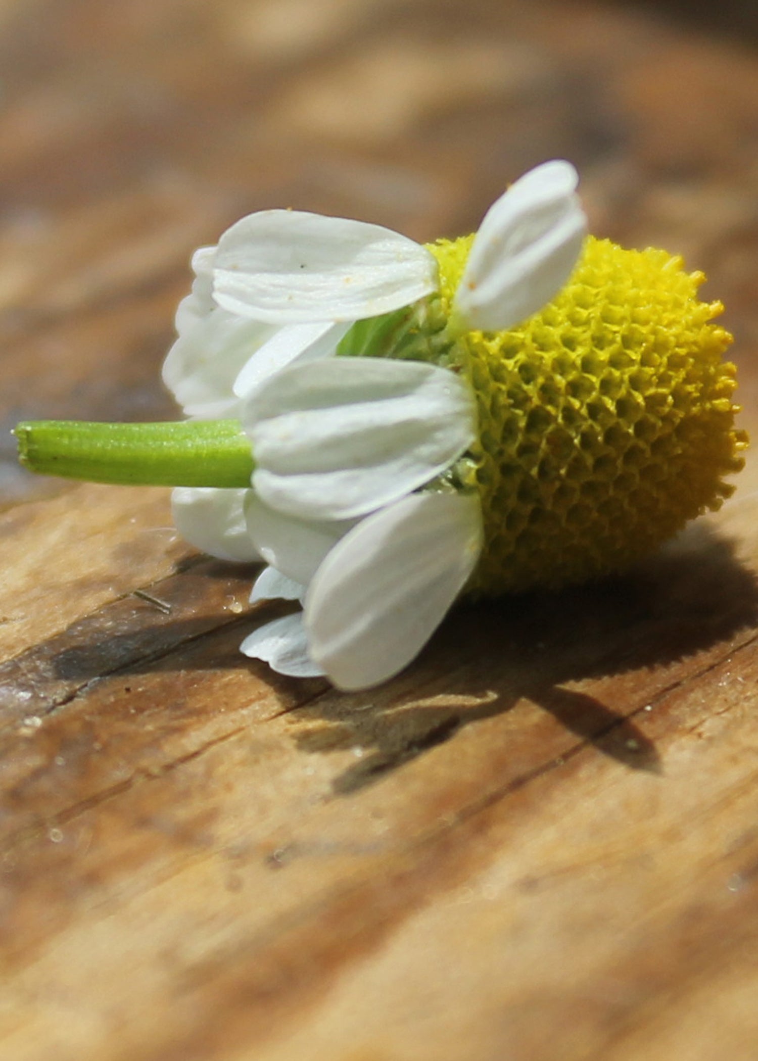Chamomile blossom resting on an aged wooden table waiting its turn to become a memory.