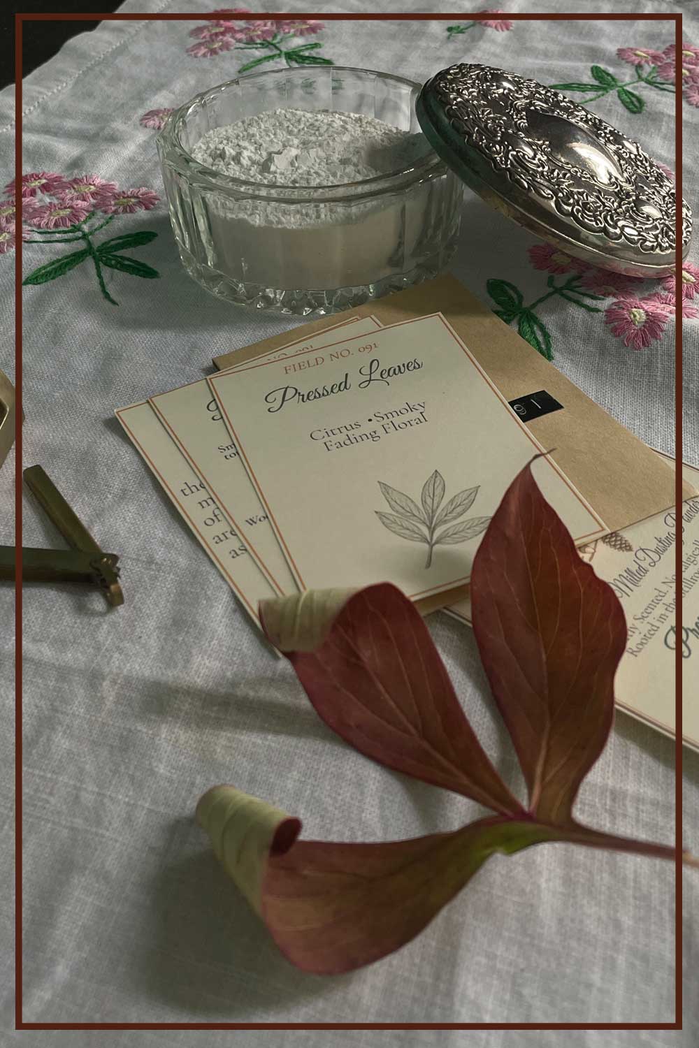 A hush settles in the stillroom as the garden fades. Citrus light lingers on the last peony leaves, and the faint smoke from the hearth drifts through the open window. Pressed Leaves gathers that moment — crisp, earthen, and softly floral — a scent of woodsmoke and sunlight folded into powder.