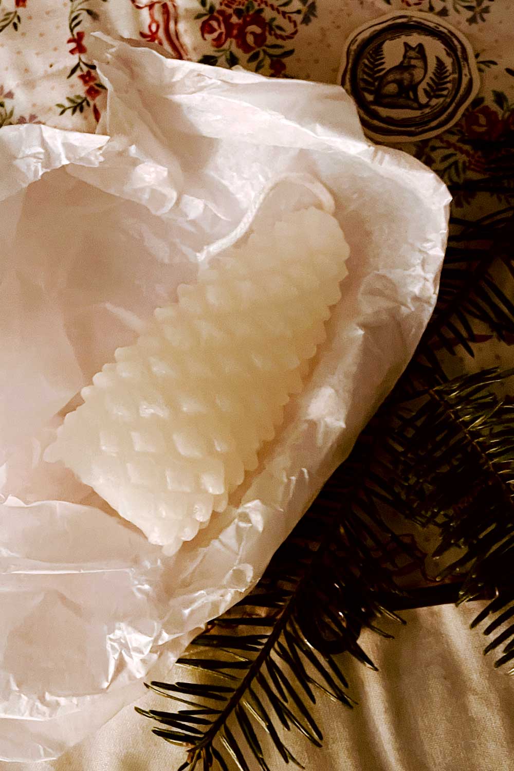 Hand-poured beeswax pinecone, wrapped in archive paper and finished with vintage press-letter tags. A small winter keepsake for mantle, bedside, or gift parcel.