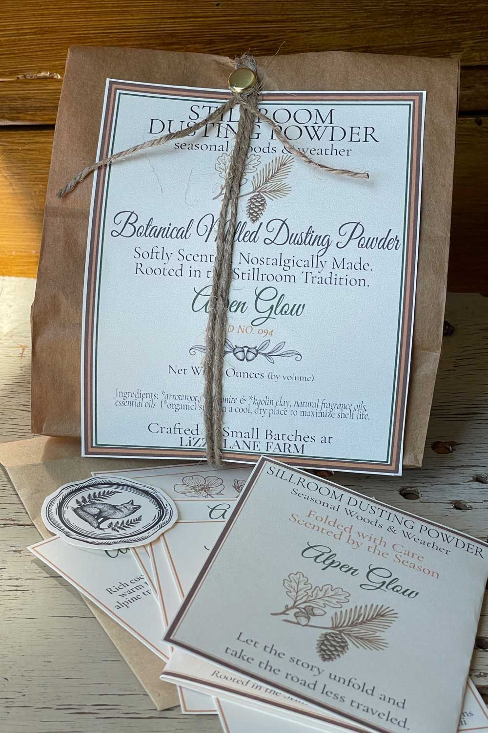 - Bulk 6 oz — Kraft-wrapped cello bag fastened with twine & brass clasp; includes Fragment Edition cards. A convenient organic body powder refill for everyday use.