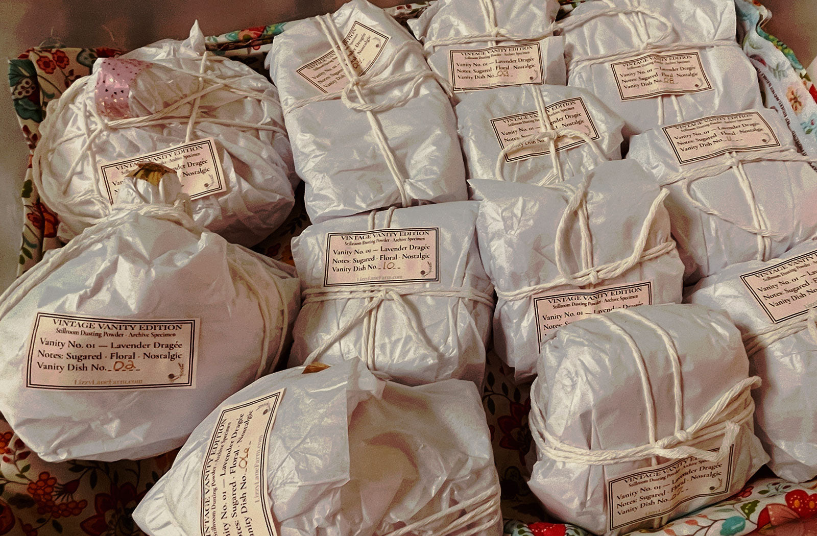 Each Vanity Dish No. 02 set is assembled by hand in the stillroom. The powder dish is wrapped archive-style in paper and cotton string, finished with a hand-applied label using traditional wheat glue. The powder is tucked into a stillroom envelope and secured beneath twine with a brass fastener.